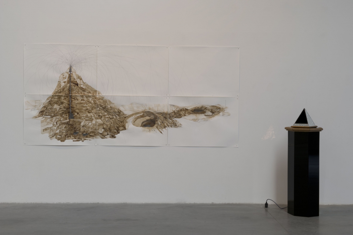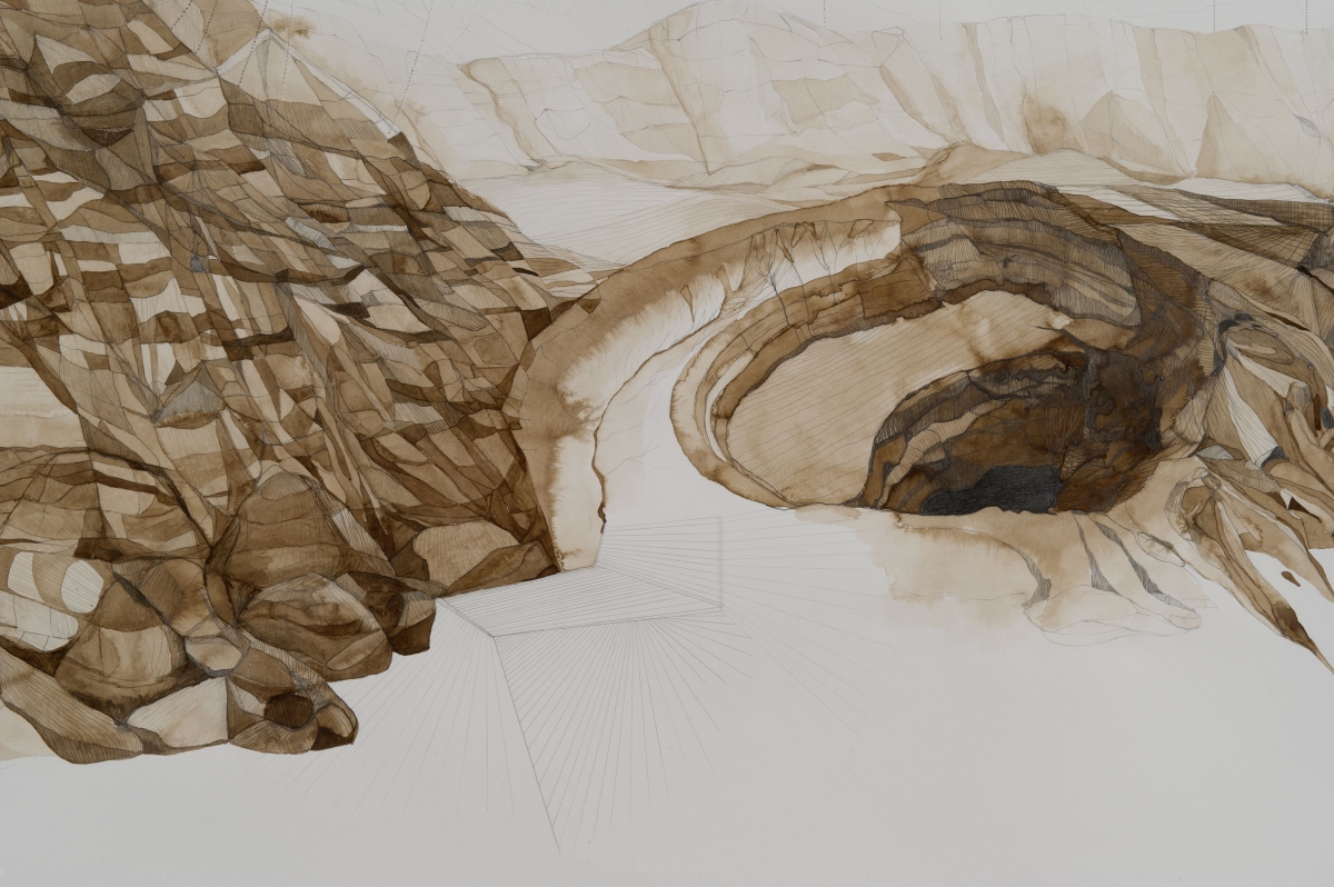 This work reflects Sunstrum’s ongoing interest in imagining intersections between mythology and science. The panoramic drawing shifts between representational, fantastical, and diagrammatic depictions of a volcanic landscape. It makes references to mythological interpretations of the underworld; geological speculations of the earth’s core; the Hollow Earth Theory; Jules Verne’s Journey to the Centre of the Earth; and 18th century European Romanticist landscape painting. The drawing emerges from Sunstrum’s observation that both mythology and science attempt to construct and deconstruct the same mys-teries-namely: the nature of things, the history of things, the power of things, and the future of things.