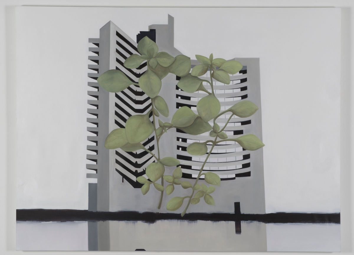 These building ‘portraits’ are part of a larger body of work investigating power and power structures.« While my approach to these new paintings has remained the same - namely that I paint the buildings of the cities that I live in or have visited in an effort to study and sometimes re-imagine the city – there is a new element in the work. The addition of plant life is an experiment with the idea of combining the human-made with the organic, and questioning the “language” that we apply to both the field of architecture and the field of plant ecology. We speak about the migration of plants using the same language that we use to speak about the migrations of people, while the formal “language” of architecture speaks about the historical forces and trends at play in the conception of the buildings around usImplicit in my examination of the structures – architectural, biological, and extending into the social and political – is an interrogation of the invisible forces that have created them. »