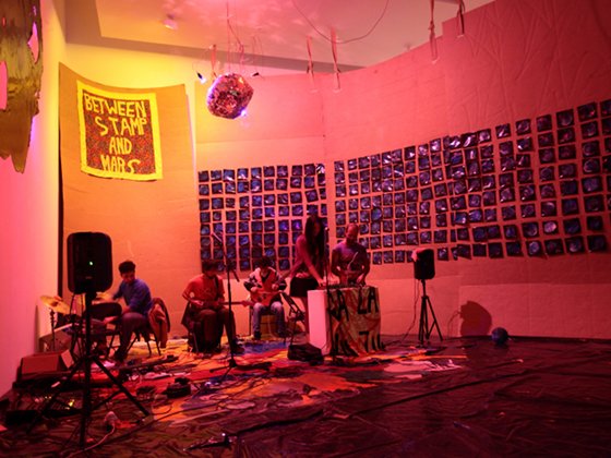 Their performance style is similar to intermedia art, as per Dick Higgins’s definition of a “borderline art” that calls just as easily upon painting, photography, video, music and karaoke.