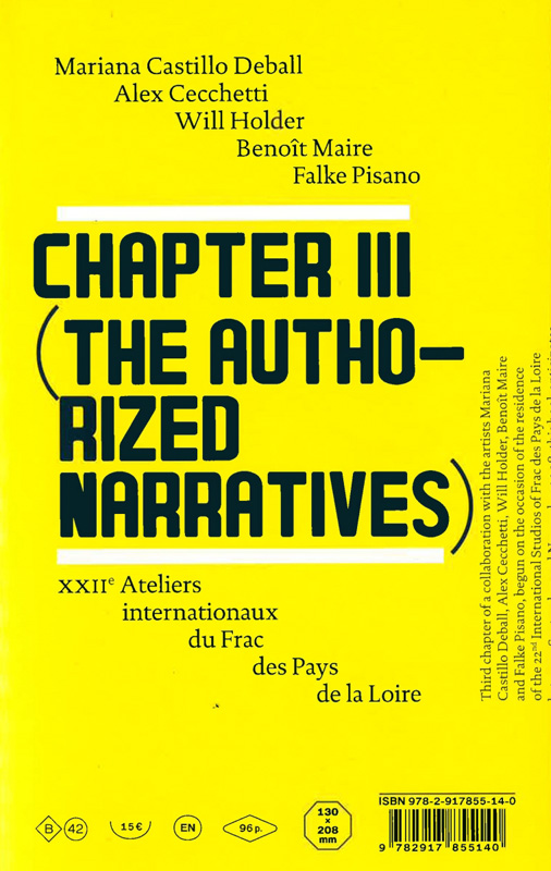 Conçues comme les premiers chapitres d'un livre à venir, ces deux expositions ont réuni des œuvres dont les combinaisons traçaient les contours de situations narratives, que les textes écrits ou réédités par les artistes dans ce Chapitre 3 viennent réactiver. Essais théoriques sous formes de nouvelles, scripts de performances, manifeste ou scénario de film, ces récits autorisés suggèrent des trajectoires croisées et des transformations constantes et mutuelles entre langage, idées et formes dans les pratiques de ces artistes.