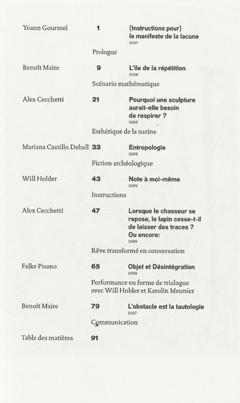 Troisième chapitre d'une collaboration avec les artistes Mariana Castillo Deball, Alex Cecchetti, Will Holder, Benoît Maire et Falke Pisano entamée à l'occasion de la résidence des XXIIe Ateliers Internationaux du Frac des Pays de la Loire entre septembre et novembre 2008, cet ouvrage anticipe, prolonge ou transpose les œuvres présentées dans les expositions Chapitre 1 (les situations discrètes) du 8 novembre 2008 au 22 février 2009 au Frac des Pays de la Loire à Carquefou et Chapitre 2 (la répétition) du 7 mars au 30 mai 2009 au Parc culturel de Rentilly, à l'invitation du Frac Île-de-France.