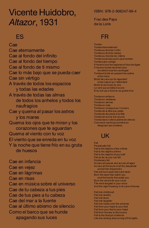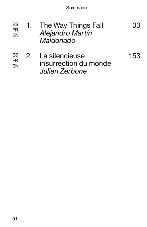 Catalogue édité à l'occasion de l'exposition, The Way Things Fall, XXXIe Ateliers internationaux du Frac des Pays de la Loire présentée au Frac des Pays de la Loire, Carquefou, du 18 novembre 2017 au 28 janvier 2018.