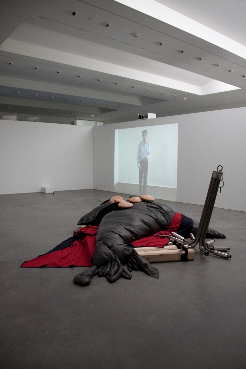 Chez Oleg Kulik la figure animale sert à dénoncer notre vision anthropocentrique. La série photographique dans laquelle l’artiste et sa famille posent nus dans des champs aux côtés d’animaux domestiques, annulent toute possibilité de domination. L’homme et l’animal se retrouvent à égalité et la relation à la nature vierge qui les entoure nous replace dans une époque pré-moderne. Pour la première fois depuis sa production, cette exposition permet de remontrer une œuvre du même artiste réalisée lors des 14ème Ateliers Internationaux du Frac à Saint-Nazaire en 1998. Au centre d’un poulailler, un personnage assis derrière un bureau est en train d’écrire. Dans la partie supérieure de la structure se nichent des poules, qui recouvrent cette statue de cire de fientes au fur et à mesure de sa présentation. Intitulée Tolstoï et les poules, l’œuvre d’Oleg Kulik vient bousculer la pratique habituelle de vénération des maîtres du passé. Le grand écrivain respecté, Tolstoï souillé par les animaux, devient ici « l’emblème passéiste et désuet d’une culture nationale et littéraire hégémonique. » Oleg Kulik parvient ici encore à renverser le rapport de force.