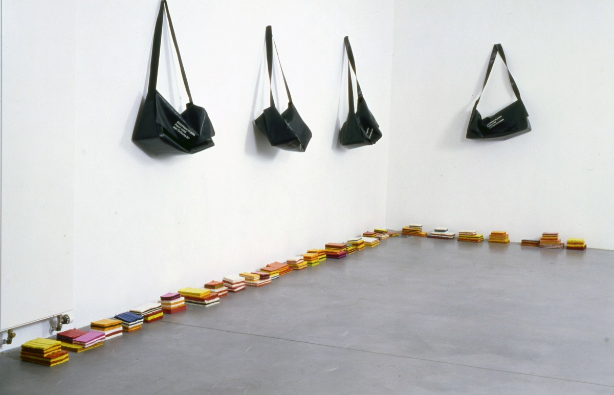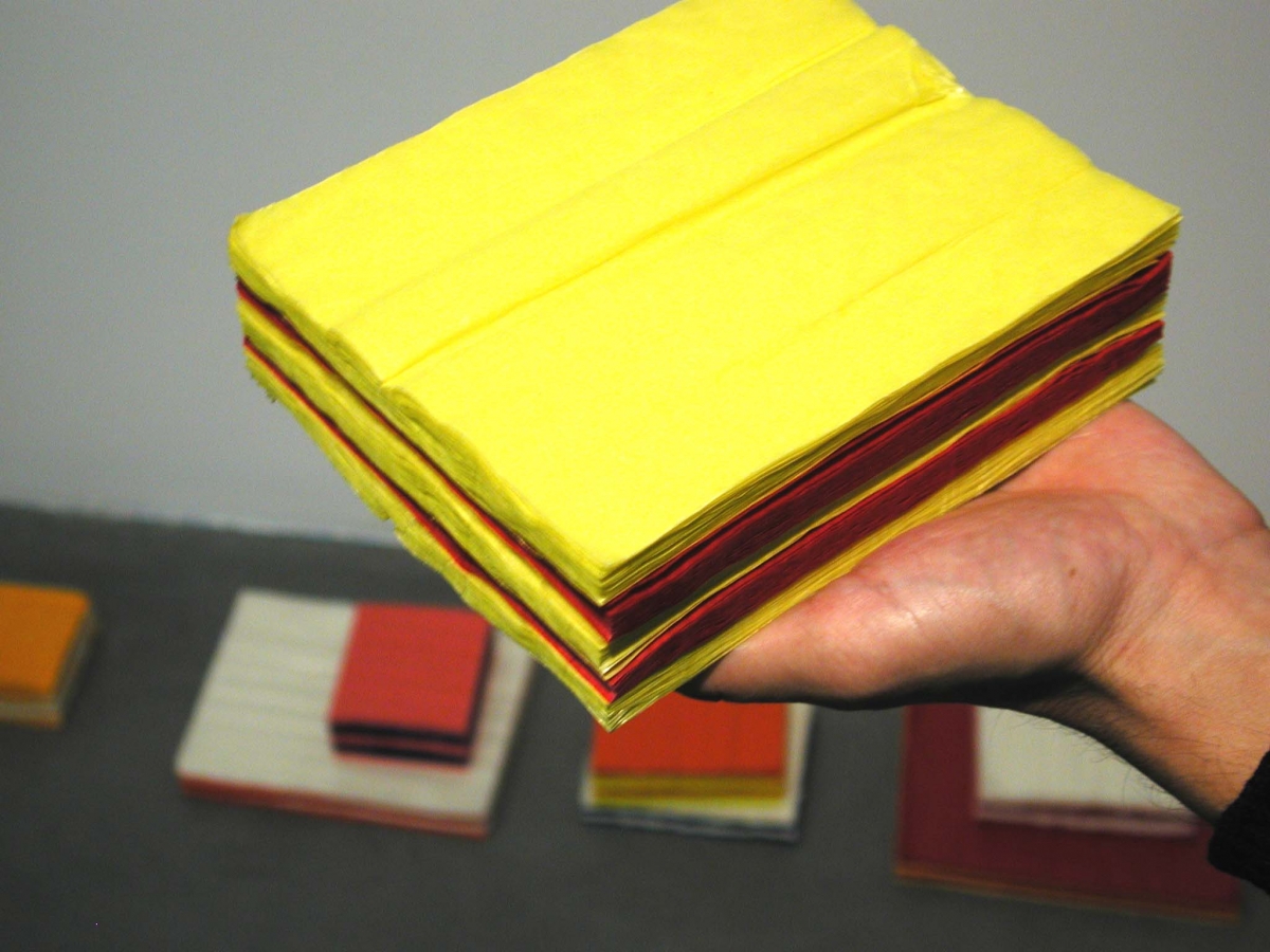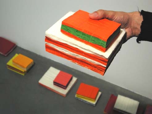 “Les œuvres proposées par Jean-Guillaume Gallais nous invitent à penser la sculpture comme outil de mutation. Le Stock et la Bibliothèque des gestes se présentent tels des objets à disposition. Fabriquées à partir de feuilles de papier de soie et de papier cristal colorées, elles ont, au repos, l’apparence de blocs de papiers ou de livres. (...) Ce sont des “sculptures à activer”, en quelque sorte. Du livre elles ont l’apparence première et aussi la structure. Le procédé mécanique consiste à coller deux à deux, suivant un schéma en quinconce, les feuilles de papier. Elles s’enchaînent méthodiquement “jusqu’à épuisement du stock". Le principe est équivalent à celui des banderoles décoratives pour les fêtes (bals, anniversaires). Les bandes verticales n’étant collées que sur leurs côtés, elles laissent pénétrer l’air en leur centre, provoquant un gonflement lorsqu’elles sont étirées.(...)”