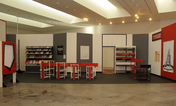 Cette «Mise en musique du Club ouvrier de Rodtchenko» par Michel Aubry respecte le dessin constructiviste et les couleurs utilisées par l’artiste russe tout en combinant des proportions empruntées aux codes de la musique sarde. Les éléments de mobilier (le dévidoir d’affiches, les sièges de l’échiquier, le présentoir de photographies, la bibliothèque, une tribune, un écran de projection, etc. ) subissent ainsi une distorsion déterminée par les notes de musique que l’artiste a gravées dans les champs de la menuiserie. Ainsi, pour la bibliothèque, la largeur de chaque tablette est égale à la longueur du son gravé dans le support. De même, l’échelle des cinq notes choisies pour former les étagères reconstruites est celle d’un Pentacorde, joué sur une canne mélodique de roseau percée de cinq trous. Pour parachever cette mise en musique, des «anches» en roseau sont fichées dans chacun des supports et le spectateur s’il soufflait dans ces «meubles-instruments» produirait la note voulue qui détermine la hauteur ou la largeur des éléments. L’artiste combine ici magistralement la fonctionnalité du Club ouvrier avec des formes qui obéissent à des échelles musicales. Enfin, «tous les objets et le mobilier sont peints en quatre couleurs - gris, rouge, noir et blanc. Le plan de coloration a une signification organisationnelle - il différencie et souligne l’utilisation, les parties et la nature des objets» (Varvara Stepanova, Le Club ouvrier, 1926).