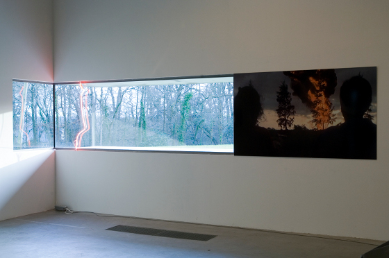 A l’extérieur du Frac, il installe une sculpture verticale acérée, réappropriation d’un symbole de la modernité mise en scène dans Rollerball, film culte de la SF tourné en 1975 par Norman Jewison. En dialogue tendu avec le paysage, l’œuvre ouvre une brèche de fiction dans la réalité, et renvoie en filigrane le spectateur à l’environnement urbain de Carquefou. A l’intérieur de l’espace d’exposition, Nicolas Moulin place une photographie au contenu elliptique : deux personnes vues de dos visent une cible improbable, vision également issue de Rollerball. Autre inclusion des projections d’un futur à l’intérieur d’un présent, autre approche de la fiction, l’image dégage une atmosphère étrange de décadence infinie et interroge l’actualité sur un mode quasi-romantique. Un vertige confirmé par la boucle sonore réalisée par l’artiste : une voix subliminale et métallique traverse l’espace d’exposition pour nous rappeler que la vie est magnifique.