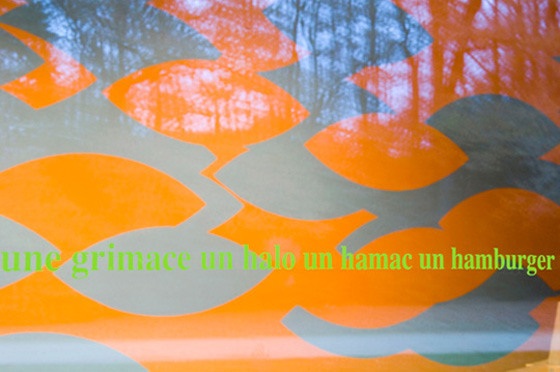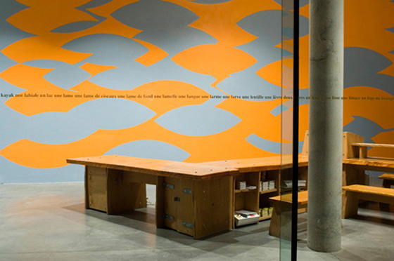 «Pour le hall du Frac ma proposition rassemble trois questions déclinées dans mon travail : l’impact de la couleur, l’apparition d’une forme et l’amplitude d’interprétation qu’elle ouvre. L’impact coloré repose sur un rapport contrasté de deux couleurs, se manifestant différemment en vision éloignée (à l’entrée du parc, à travers les vitres) et en vision proche, dans le hall. L’organisation globale des formes sur le mur emprunte librement à un principe ornemental, permettant au regard de jouer à cache-cache avec les signes, visibles alternativement en positif ou négatif. Le mur est peint dans sa totalité, dans un jeu optique « all over » de formes/contre-formes, augmenté par la vibration chromatique. Enfin, une liste de mots inscrits sur la baie vitrée propose au visiteur les noms possibles de cette forme». Pierre Mabille