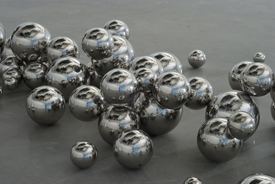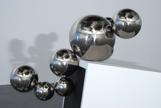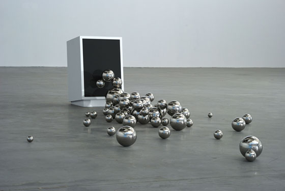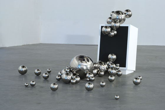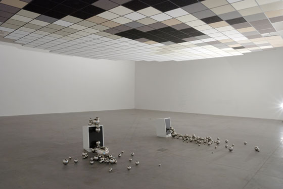 Pour le Frac des Pays de la Loire, Saâdane Afif structure l’exposition One, autour d’un thème récurrent dans son œuvre : la Vanité, sujet exprimé antérieurement au gré de pièces formellement éclectiques (Vanité, post-it, Le vrai scandale c’est la mort, Power chords...). L’artiste réunit pour cette installation inédite, intitulée Re : Tête de mort, nombre des codes du genre : le crâne, la bulle de savon, le miroir, la musique... La référence à la peinture est omniprésente, et inclut la pratique de l’anamorphose, cet « art de la perspective secrète». En effet, les dalles monochromes qui donnent corps au vaste plafond suspendu dans la salle Jean-François Taddei semblent au premier regard placées selon un schéma abstrait sans réelle cohérence. Elles recèlent cependant une vision latente, que le procédé de pixellisation maintient entre présence et absence. Les grappes de bulles-miroirs posées en équilibre sur deux socles-enceintes portent en elles autant de points de restitution de ce motif qui flotte dans l’espace comme un présage d’image.