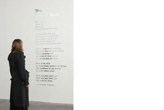 Par ailleurs, Saâdane Afif affirme sa qualité de «sculpteur de liens» : il invite Judicaël Lavrador, critique d’art et commissaire, à écrire un texte poétique sur l’œuvre. La forme (des phrases simples, comme dans beaucoup de textes pop), l’idée, la façon dont le texte apparaît dans l’exposition sont pensées et développées comme un processus rigoureux au sein même du travail de Saâdane Afif. À partir de ces contraintes fortes, Judicaël Lavrador déploie son propre imaginaire qui vient nourrir l’œuvre d’un nouveau point de vue, la traduire, la diffracter, l’abstraire aussi.