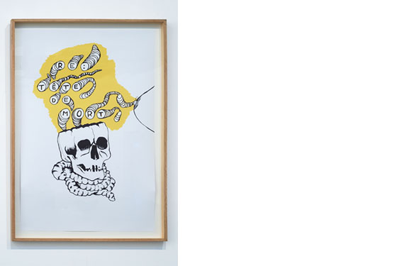 Un autre dialogue, une autre part d’échange naît de la collaboration avec le duo de graphistes deValence : via les outils qu’ils possèdent (le graphisme, la mise en forme, la typographie, etc), Saâdane Afif les entraîne à donner leur propre lecture de l’œuvre Re : Tête de mort à travers une affiche. En résulte cet étrange poster rock’n’roll et symboliste, réponse inattendue qui témoigne en filigrane du plaisir éprouvé par Saâdane Afif à se faire surprendre par des formes qu’il n’aurait pu développer lui-même et qui enrichissent son travail d’interprétations inédites.