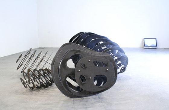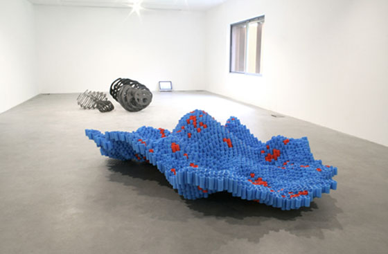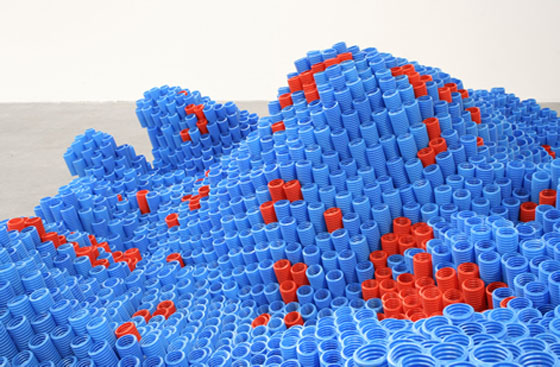 Plus récemment, Vincent Mauger propose des va-et-vient constants entre construction volumineuse (plaisir d’exploration du matériau, défi du chantier parfois monumental) et légèreté virtuelle. Dans les effusions numériques de notre ère contemporaine, il réintroduit du jeu, couplant une dimension plus primitive, un imaginaire plus artisanal à la sophistication des logiciels 3D. L’installation Sans titre 2007, présentée en 2008 à la galerie LH, confirme ce pouvoir d’hybridation : des lignes souples sculptent la surface alvéolaire de tubes PVC assemblés verticalement, et cet ensemble convoque instantanément son double modélisé, sa représentation virtuelle. Le système de construction (basé sur la multiplication, le foisonnement) permet de poursuivre mentalement la pièce, d’en imaginer les prolongements bien au-delà du lieu d’exposition, dans une dynamique de l’expansion et de l’envahissement.