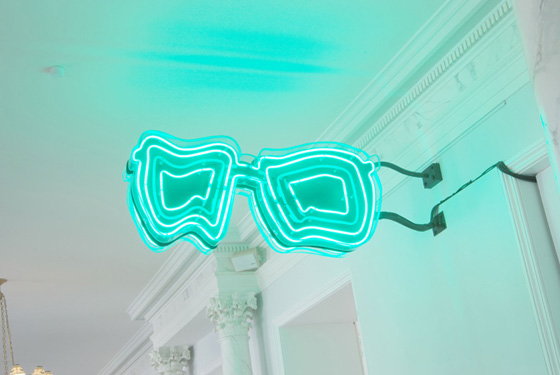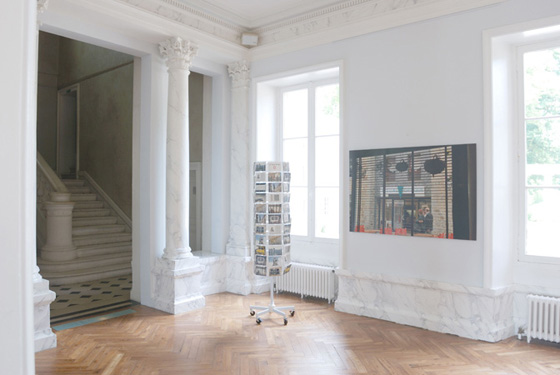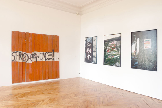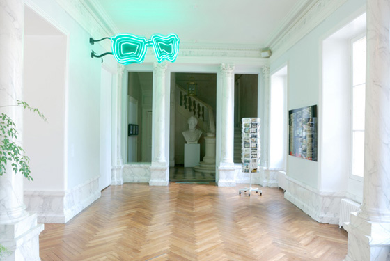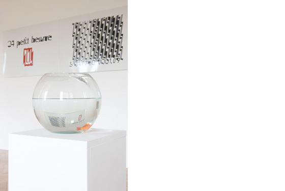 Les artistes exposés, qui, à une exception près, appartiennent à la génération née entre 1960 et 1970, développent en effet dans leur oeuvre une dimension politique qui n’intervient pas chez Hains : réflexion sur le signe publicitaire ou sur les modes de perception du réel (Franck Scurti, Philippe Durand, François Curlet). Quatre oeuvres de Gérard Collin-Thiébaut, Yann Sérandour, François Curlet et Anabelle Hulaut font directement intervenir la figure de l’artiste, en l’intégrant ou en la déjouant. Les autres rapprochements procèdent d’une logique indirecte, en particulier dans une approche de la question du langage et de sa représentation (François Curlet, Claude Closky, Philippe Durand). Scène urbaine filmée à travers un verre de bière, la vidéo Heineken Vision de Franck Scurti est une machine à perception. Visuellement, le défilement des passants perçu à travers le liquide gazeux évoque de façon saisissante les mouvements colorés du film Pénélope. Un autre rapprochement se fait immédiatement avec la vision poétique des photographies hypnagogiques. Si ce n’est qu’à la différence de Hains, Scurti observe simplement la déformation du réel : la série d’enseignes Les Reflets joue sur la perception