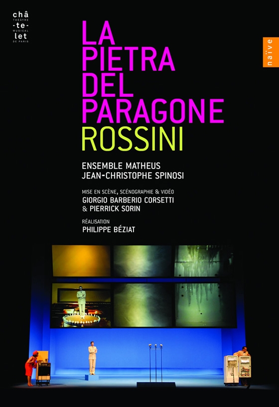 Mis en scène au Théâtre du Châtelet en 2007 par Giorgio Barberio Corsetti et Pierrick Sorin, l’opéra de Rossini La Pietra del Paragone reposait sur un dispositif vidéo inédit. De part et d’autre de la scène, des techniciens manipulaient des décors miniatures filmés par des mini caméras et projetés sur deux rampes d’écrans suspendus. Les chanteurs et comédiens évoluant sur fond bleu, étaient filmés et inscrustés au décor en temps réel.