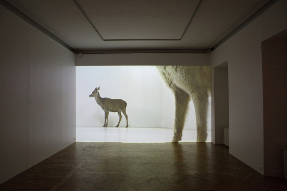 Ballard décrit un lieu hors du temps, où les maisons sont des entités vivantes. Ponctuées ici ou là d’éléments mystérieux comme le Wendemantel de Regina Möller, le Ventilator de Gabriel Orozco ou encore les sculptures polychromiques David ou César de Hans-Peter Feldmann, elles relèvent d’une «inquiétante étrangeté». Habitation instinctive, vivante voire animale? Le film Deeparture de Mircea Cantor évoque la figure classique de l’intrusion de la sauvagerie et de la nature dans la civilisation, telle une des fables de La Fontaine légèrement modifiée: un loup fait face à une biche dans l’espace minimaliste de la galerie d’art, créant ainsi une tension entre l’éventuelle proie et son prédateur, à l’instar de la maison barbare décrite par Ballard. C’est à ce même thème que les dessins My Dog is Houwling de Trixi Groiss semblent apparemment répondre, si ce n’est qu’ils représentent des chiens policés soulignant, au contraire, la manière dont la dimension civilisatrice et la norme sociale peuvent nourrir des tourments. Réceptacle d’événements heureux ou tragiques qui s’y sont produits et qu’elle rejoue encore et encore avec ses habitants successifs, la maison dépasse la classique notion d’intérieur qu’en son temps Walter Benjamin avait qualifiée à la fois d’«antre» et d’«étui», seuls refuges face à la ville moderne, et envisagée dans sa dimension «physiognomiste» et mnésique, comme s’il s’agissait du relevé comptable des traces d’hypothétiques locataires. Comme lorsque Julien Audebert construit une image apparemment banale d’un salon, Studio, qui est l’exacte reprise du plan-séquence du film La Corde d’Alfred Hitchcock. À ce détail près que le point de vue de la photographie est celui du buffet, dans lequel les protagonistes du film ont caché le corps de l’ami qu’ils viennent d’assassiner afin de démontrer que «tuer est un art». Habiter l’espace, à l’instar du récit de Ballard, se détourne de ses origines fonctionnalistes et sécurisantes pour lui substituer empathie et émotions. Il en est ainsi de l’altération de la perception de l’environnement par la vibration psychosensible colorée de la diffraction de couleurs d’Orange, Sea Blue d’Ann Veronica Janssens ou, dans un autre registre, de Psychoarchitectures de Berdaguer et Péjus qui traduit en volume des dessins de maisons réalisés par des enfants ayant subi un traumatisme, glorifiant ainsi l’activité de la psyché qui met en déroute toute tentative de rationalisation.