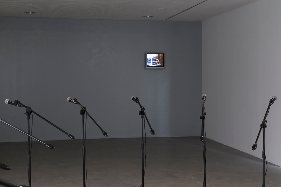 Le travail de Dominique Blais entretient un rapport au son, qui sans être exclusif, en fait un élément prépondérant. D’une pièce à l’autre, il révèle à notre conscience des sons non amplifiés, captifs de l’appareil qui les produit, de légers bruits habitant le silence ou des fréquences imperceptibles à l’oreille humaine. Lors de son projet de résidence dans le village de Ny-Alesund (Norvège), localité la plus au nord de la planète, l’artiste a réalisé des enregistrements de fréquences VLF (Very Low Frequencies), qu’il a ensuite « ramenées à la sphère de l’ audible »1. L’installation qui en résulte, Spherics (2009), est composée d’enceintes rondes suspendues au plafond comme autant d’astres éclairant la voûte céleste.