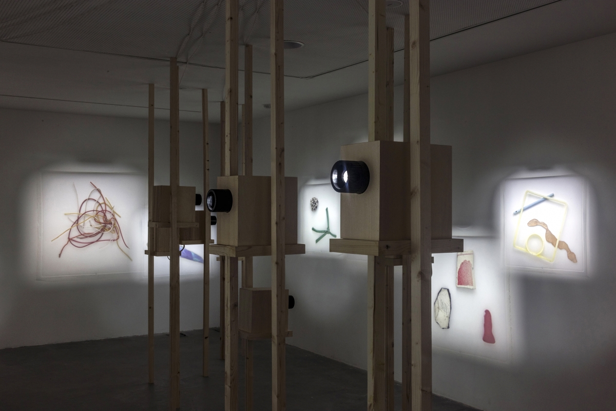 C’est de cet émerveillement pour l’objet familier et de son re-dévoilement dont il s’agit dans l’installation Fantasmagorie, présentée pour la première fois au Frac des Pays de la Loire. A partir de mini-sculptures, confectionnées à l’aide d’objets trouvés dans le lieu d’exposition et ses alentours, l’artiste utilise le procédé de lanterne magique pour nous donner à voir leurs images éclatantes projetées à même le mur de l’espace.