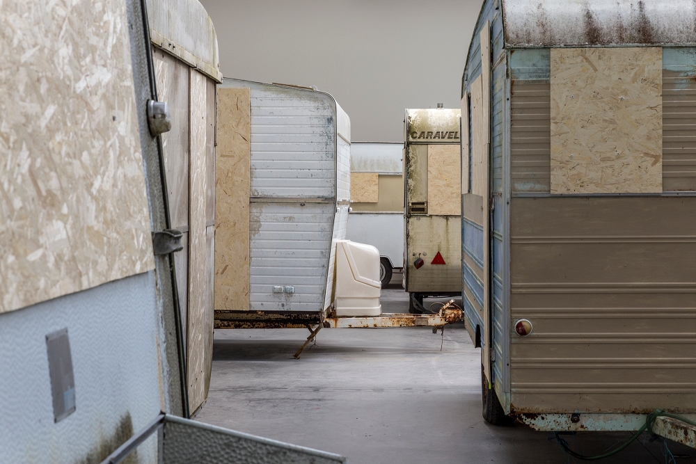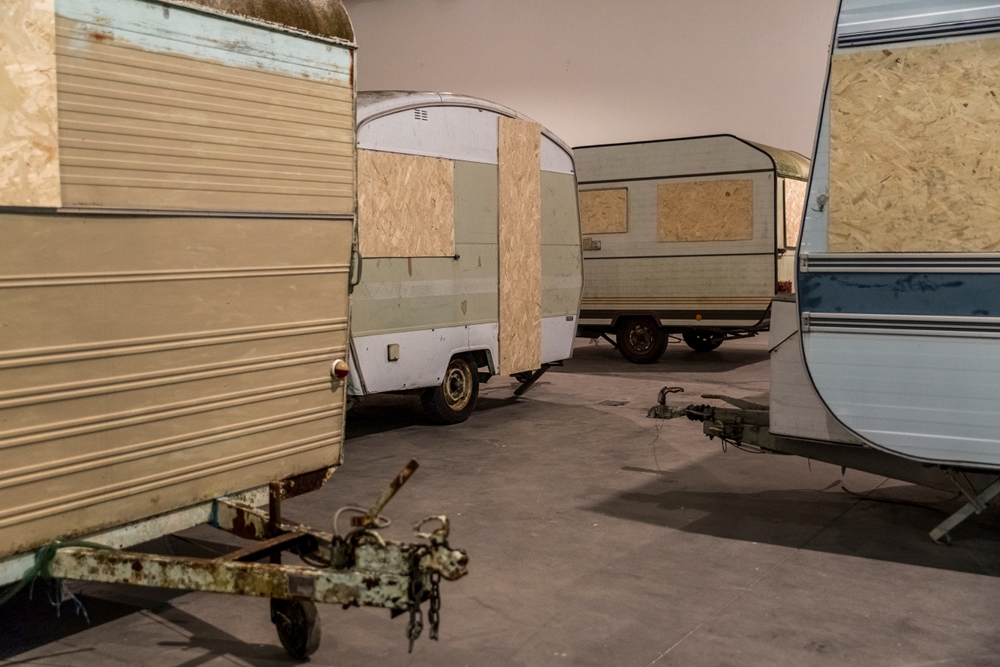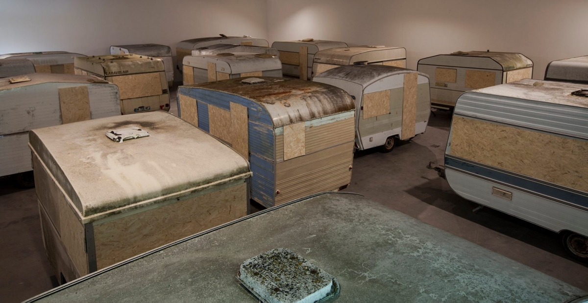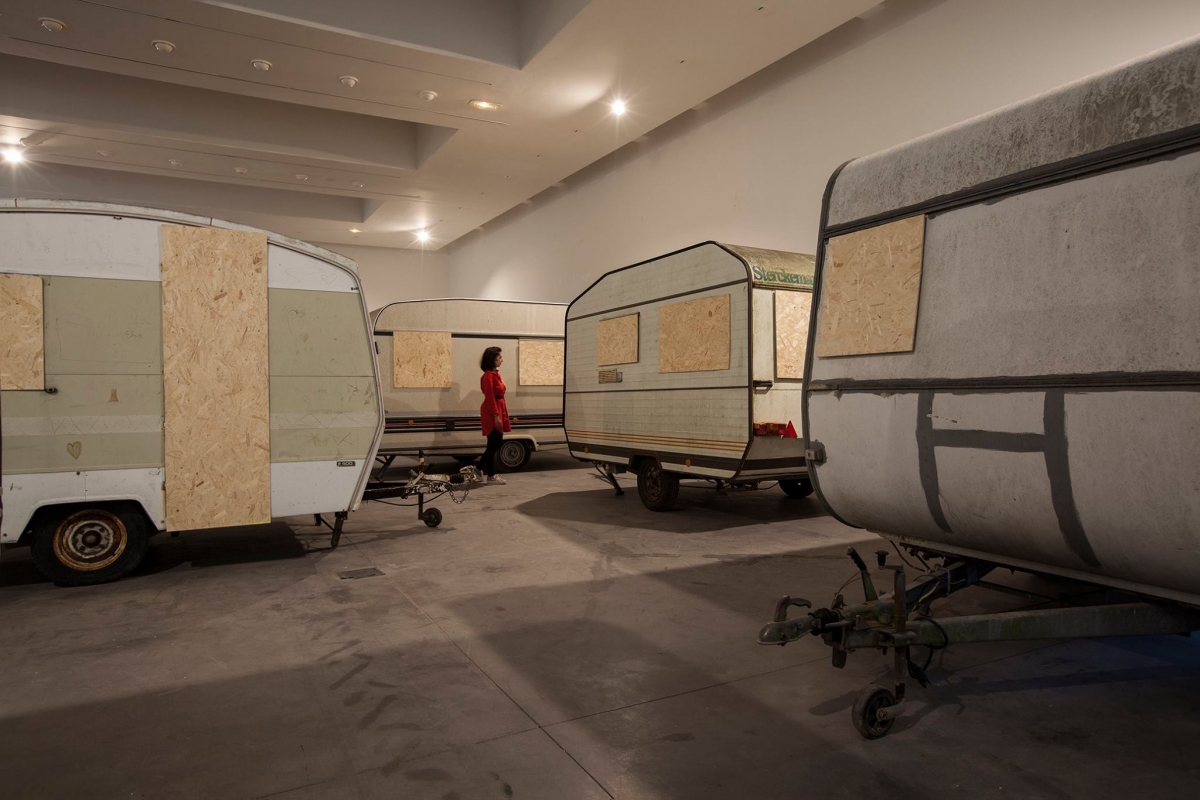 17 caravanes dont les ouvertures ont été obstruées par des planches de bois, formant un campement labyrinthique et oppressant à travers lequel les visiteurs seront invités à se frayer un chemin, avec pour seul horizon la prochaine caravane.