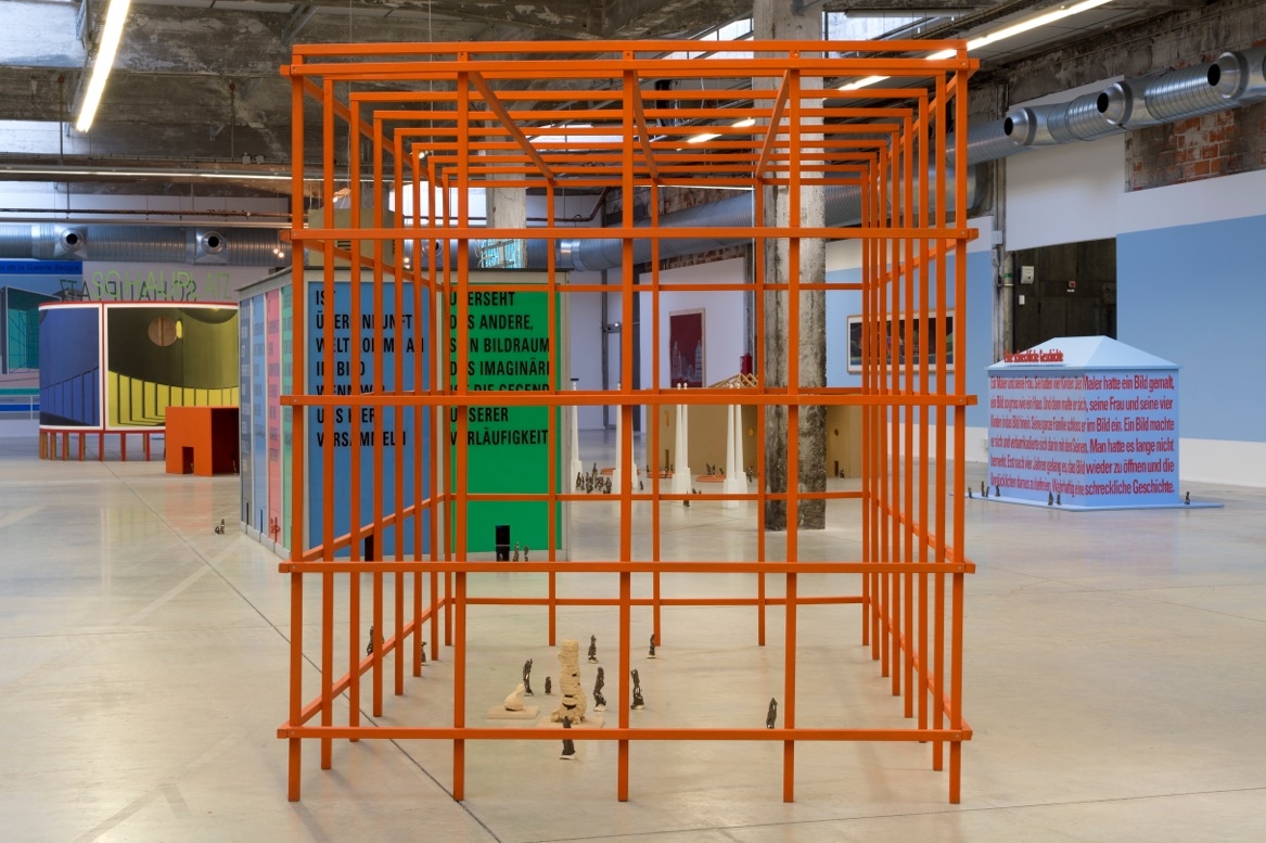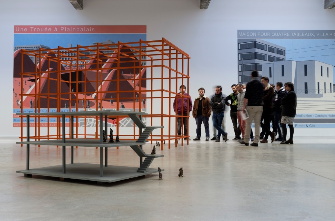 Depuis 1982, Thomas Huber poursuit une réflexion à la fois théorique et pratique sur la peinture et l’image, sur leur fabrication, leur mise en espace, leur rôle aussi dans notre civilisation occidentale moderne qui a fait une place centrale à l’art, au spectacle et à leur capacité à former des spectateurs et un public. Les espaces qu’il évoque dans ses peintures et installations, dans un style froid, distancié – bibliothèque, théâtre, atelier de l’artiste, forum, salle d’exposition – rappellent tant par leur fonction que par leur facture la tradition moderniste, depuis les représentations renaissantes de la cité idéale en vogue à la cours d’Urbino jusqu’aux cités imaginées par Le Corbusier (symbolisées par la reprise de la Maison Domino) et l’Ecole d’Athènes, en passant par l’architecture idéale de Ledoux et Boullée. Que ce soit par le biais de ces maquettes au caractère éminemment théâtral ou par les panoramas et toiles qui l’accompagnent, Huberville évoque indéniablement l’espace telle que la tradition picturale moderne l’a conçu, régi par la perspective, rationnel, utopique et prospectif, en tant qu’il met en scène une polis idéale et, par extension, une communauté de citoyens à réaliser.