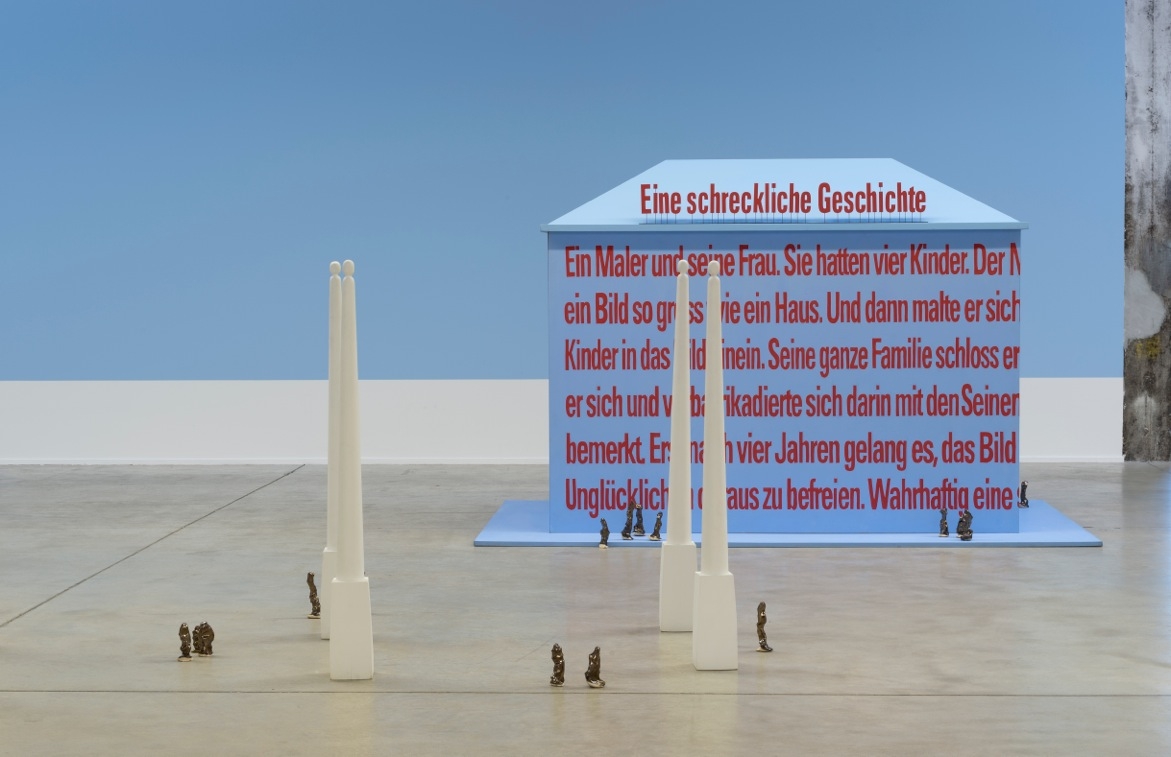 C’est aussi l’espace de l’artiste par excellence, au sein duquel Thomas Huber se met en scène avec sa famille, que ce soit par le biais de la Kunstler Haus (Maison de l’artiste) ou du Clocher, référence à son père architecte et constructeur d’églises, dont on retrouve l’écho dans le titre même de l’installation, Sonnez les matines et dans les cloches omniprésentes dans l’œuvre de l’artiste. Espace intime, enfantin peut-être, mais non moins inquiétant comme l’exprime Eine schreckliche Geschichte (Une histoire épouvantable), maison sans ouverture dont la façade raconte l’histoire d’un peintre enfermé avec sa femme et ses quatre enfants dans le tableau, grand comme une maison, qu’il était en train de peindre... On ne peut, lorsque l’on visite Huberville, lorsque l’on contemple les allées monumentales et la grande horloge, ne pas être saisi par un sentiment d’« inquiétante étrangeté », le même qui sans doute saisit un jour Giorgio de Chirico à Turin pour ne plus jamais le lâcher... Les images de Thomas Huber sont comme figées dans leur projection, peuplées de fantômes et d’esprits qui ne parviennent jamais vraiment à s’y incarner, à moins qu’elle ne cherchent à happer le spectateur qui les regarde : espace imaginaire, utopique sans doute, mais non moins potentiellement oppressant.