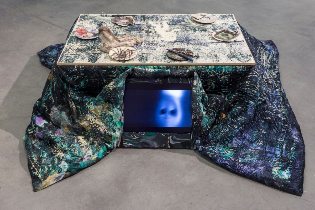 "morceau de frustration", (kotatsu), 2018, 80 x 120 x 55 cm, bois, céramique, pâte fimo, tissu teint