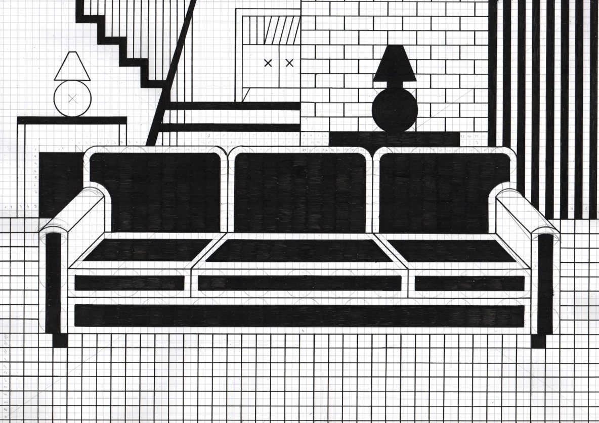 (…) Dans la forme, Olivier Garraud défend une esthétique modeste, « qui n’aurait l’air de rien » : son support, la feuille quadrillée, renvoie aux dessins des cahiers d’école, de ceux qui comblent l’ennui et autorisent de petites et grandes échappées. L’artiste utilise toujours les mêmes outils, des règles, des feutres, parfois des Rotring, et il se restreint strictement au noir et au blanc. (…) Côté iconographie, certains motifs apparaissent de façon récurrente : le supermarché, la barrière, l’automobile, le salon générique des sitcoms télévisuelles… autant d’environnements qui racontent nos sociétés fragmentées et leur désenchantement palpable. »