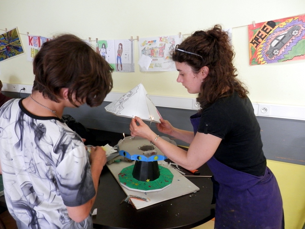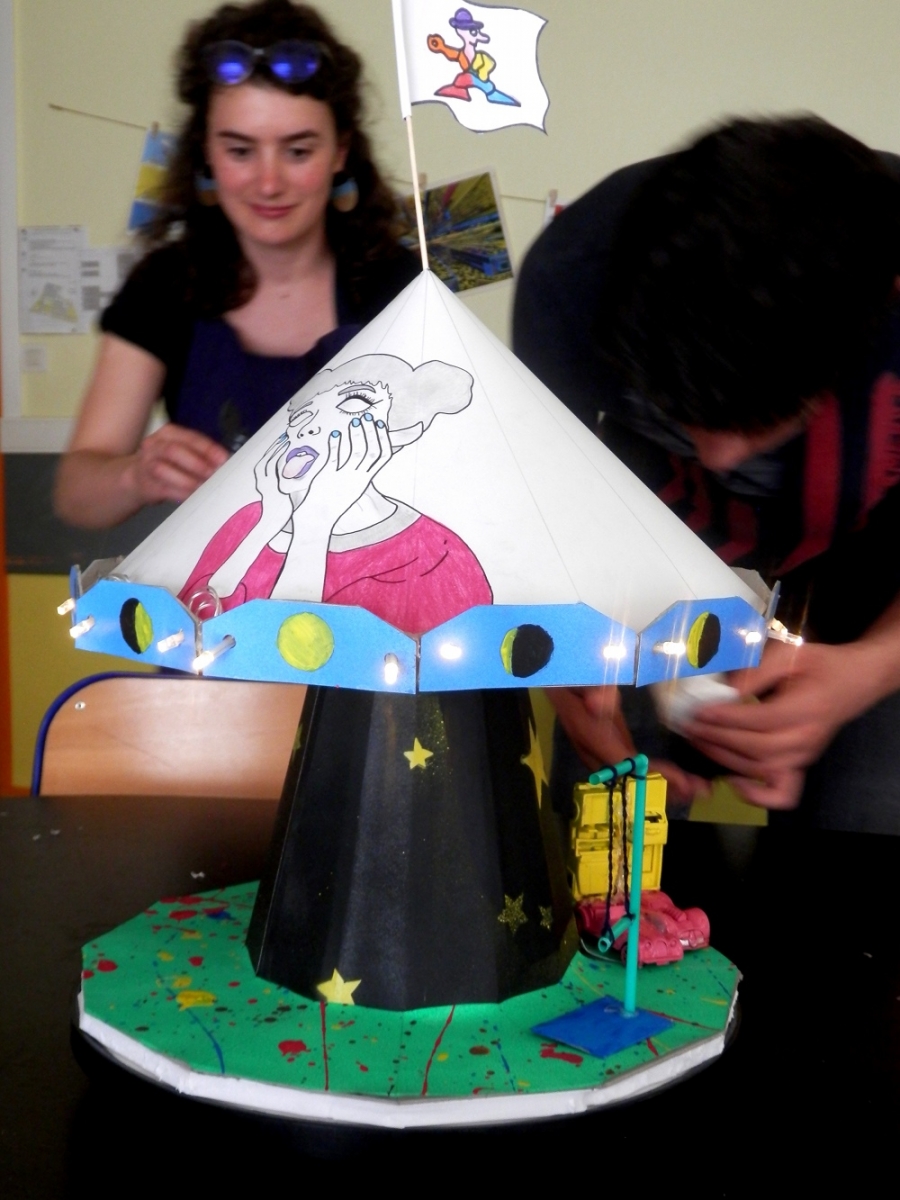 Marine Class intervient au nom du Collectif « Les Fondeurs de roue », auprès d'une classe de 1ère Technicien d'usinage, au Lycée professionnel Robert Garnier, La Ferté Bernard (72). Elle propose aux élèves de réaliser leur propre maquette du "Fondeur Blaster". Le manège « FONDEUR BLASTER » est la première création du collectif des Fondeurs de Roue. Depuis 2012, des plasticiens, des techniciens et des acteurs de la culture ont œuvré ensemble à la réhabilitation d’un manège de collection des années 1900 en espace d’exposition itinérant et praticable pour l’art contemporain.