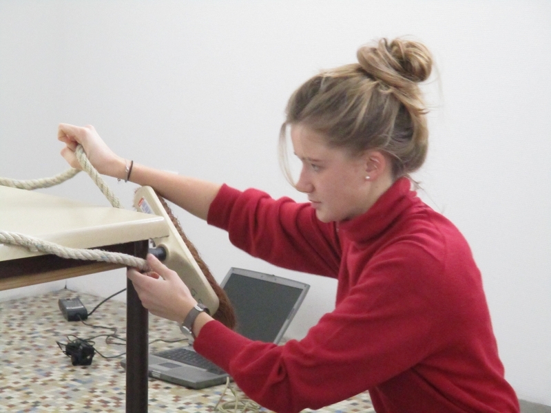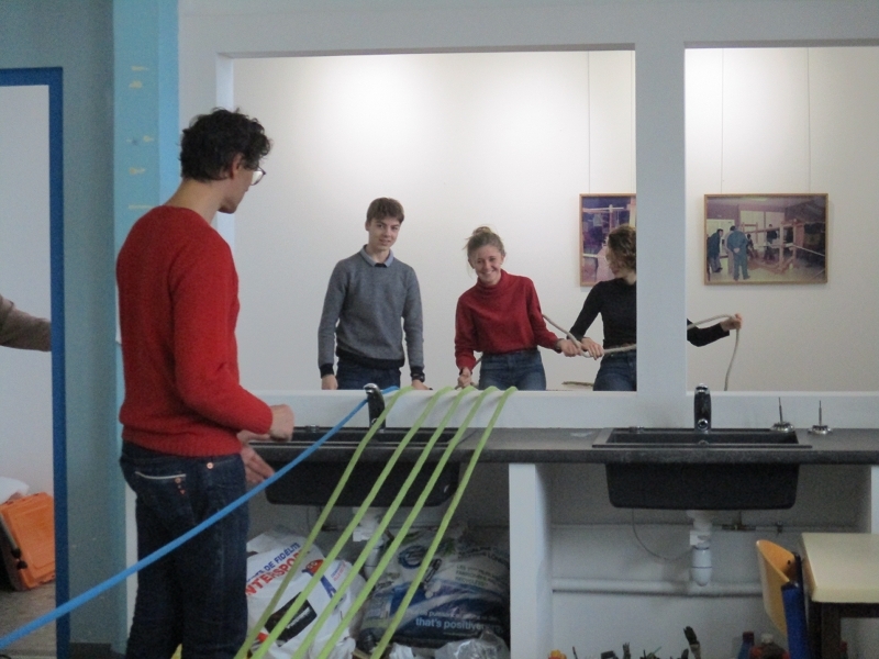 Au lycée Saint-Louis, les artistes ont engagé un dialogue autour de leurs œuvres et proposé aux élèves de poursuivre avec eux leurs recherches autour du tissage, et notamment du tissage collectif et performatif.