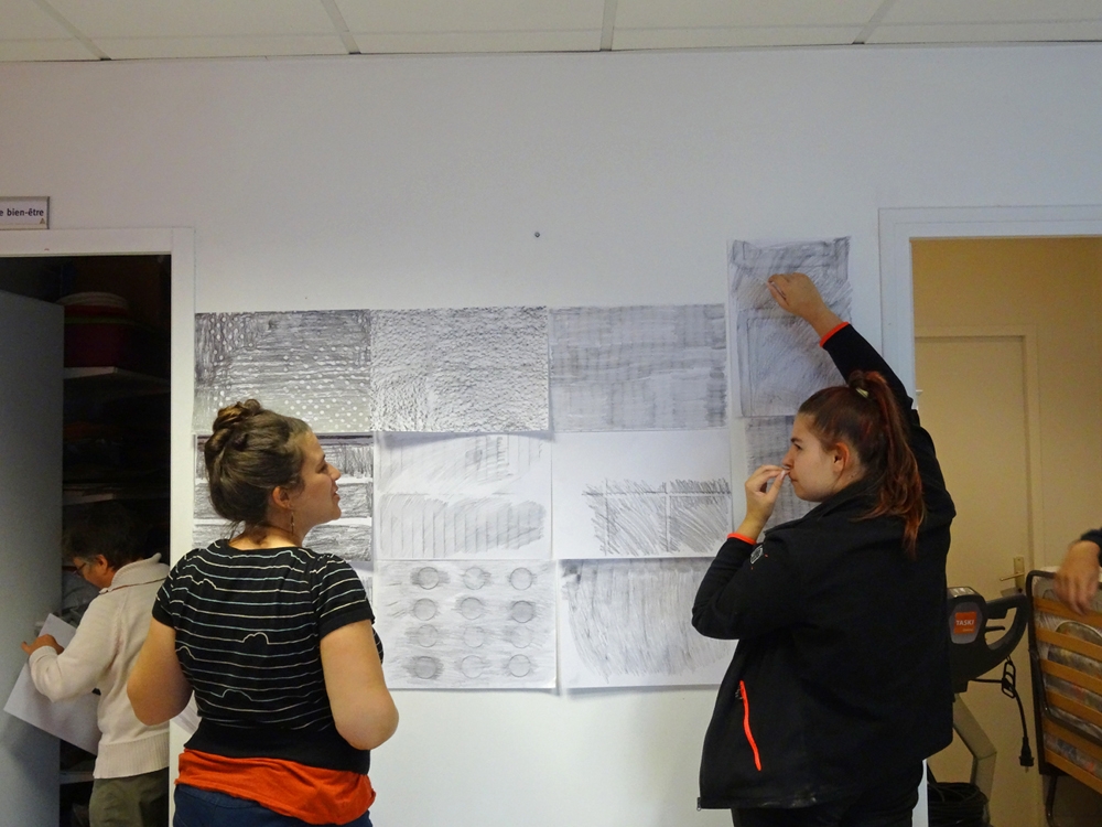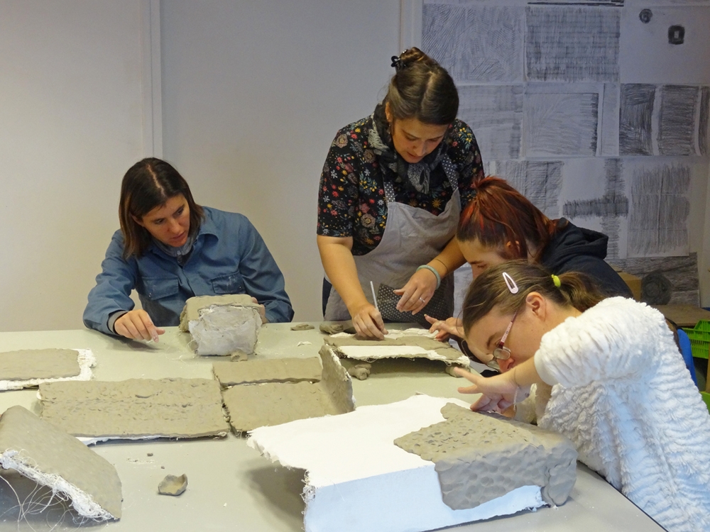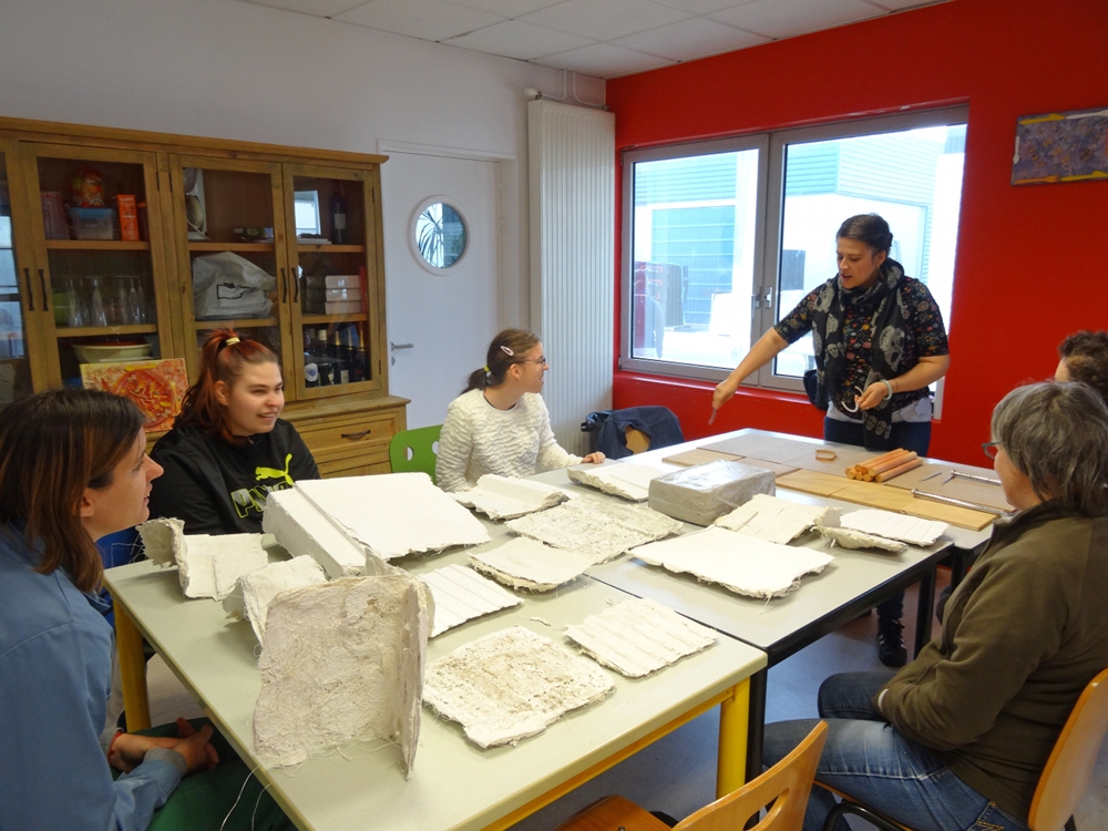 Le groupe, composé de huit travailleurs handicapés, a expérimenté les gestes, les techniques et la démarche artistique, guidé par Chloé Jarry. A partir d'observation de leur environnement de travail, les participants ont repéré puis cadré des détails de l'architecture de l'ESAT : un recoin de la salle de pause, une plaque d’égouts à l'extérieur, l'angle d'un meuble, un interrupteur... autant de choses banales sur lesquels l'œil ne s'attarde pas habituellement. Par frottage d'abord, puis avec du plâtre, ils ont relevé les empreintes de ce décor quotidien. Les séances suivantes, avec de la terre, le groupe est venu estamper ces éléments. Ensemble, ils ont créé des formes. Un rendez-vous avec une médiatrice du Frac leur a également permis de découvrir d'autres artistes et de multiples œuvres, des vidéos, des livres et des jeux.