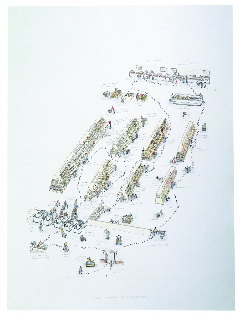 La promenade en ville, La promenade au parc, La promenade en bateau, La promenade en vélo, Les courses au supermarché, sont autant de promenades de Jean-Jacques Rullier acquises par le Frac à l’artiste en 1994. Avec cette série intitulée Promenade, suite berlinoise Jean-Jacques Rullier inventorie d’infimes parcelles d’espaces comme autant de fragments de l’expérience de chacun d’entre-nous : « grâce à leur potentiel de cheminements possibles dans ces dessins, l’important est de donner une idée de la quantité infinie d’informations que nous recevons à longueur de journée sans même y prêter attention. Un matériel de sensations et d’impressions remplace cette fois les objets de mes autres séries».