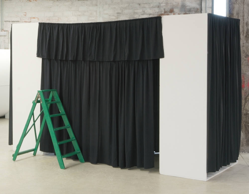 Bois brut et peint, tissu, tringles métalliques, escabeau en bois peint, 210 x 368 x 125 cm