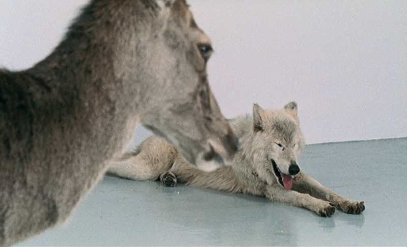 Dans le white cube d’une galerie, un loup et une biche se tournent autour, feignant l’indifférence. La neutralité de l’environnement réduit leur instinct d’attaque ou de fuite et fait apparaître des émotions plus « humaines » comme la peur et l’incertitude. Deeparture est un film muet qui crée le sentiment inconfortable de ne plus reconnaître le fonctionnement de la hiérarchie et de la domination associées à la «nature». L’artiste semble évoquer la performance de 1974 où Joseph Beuys, sans poser le pied sur le sol américain, avait été déposé, enveloppé dans du feutre, à la galerie new-yorkaise René Block, pour partager l’espace avec un coyote pendant une semaine. Contrairement à l’approche symbolique de Beuys concernant la figure de l’artiste vis-à-vis de l’animal sauvage, Mircea Cantor s’intéresse à l’ambiguïté de la domestication, à la fois de la nature et de l’espace artistique, et instaure un climat de surveillance où la confrontation reste irrésolue.